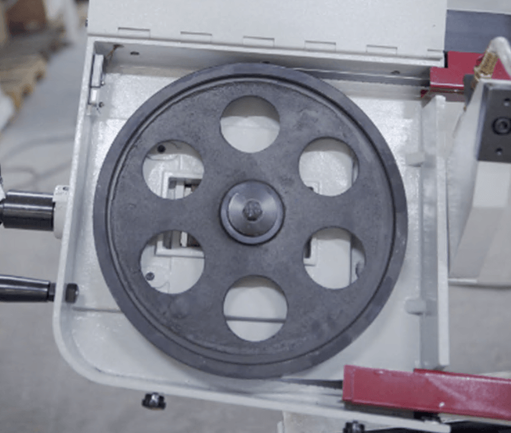 Механическая дисковая щётка (приводимая в движение от движения полотна). Зубчатый блок, с твёрдосплавными платинами и подшипниками для выпрямления полотна в зоне резания и качественной фиксации для стабильного пиления. |